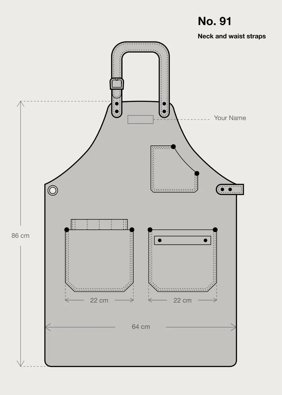 Unsere Nr. 91 sticht mit ihren verstellbaren Hals- und Taillengurten heraus, die die Schürze gänzlich an den individuellen Körper für optimalen Komfort anpassen lassen. Zwei mittelgroße Taschen, eine kleine Handytasche und ein Gurt für Küchenutensilien/Tücher bieten Ihnen mehrere Aufbewahrungsoptionen und